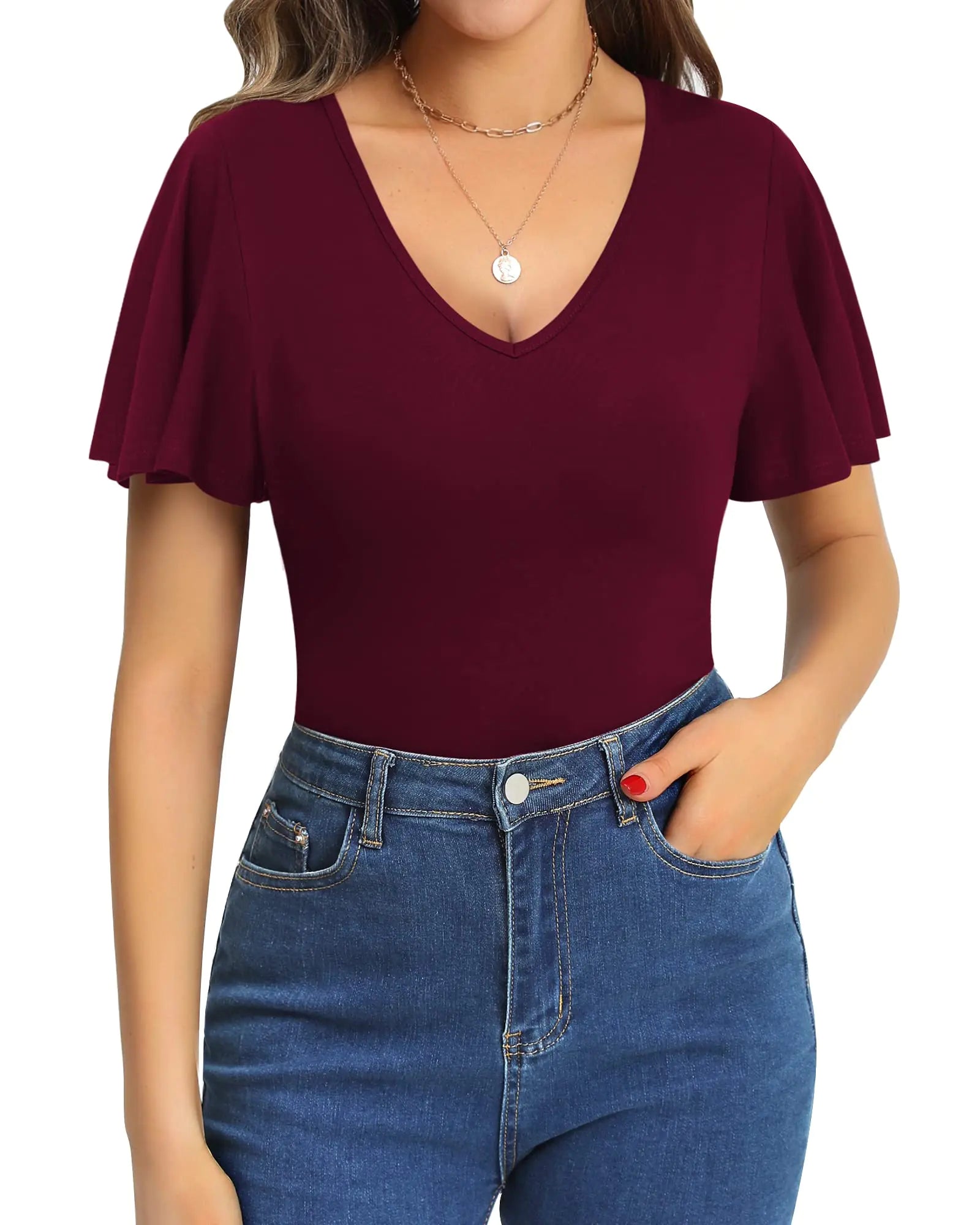 DescriptionMANGOPOP Womens Deep V Neck Ruffle Short Sleeve Tops Sexy Bodysuit for Women Clothing